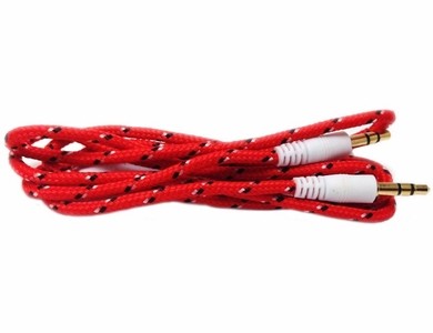 This braided auxilary audio cable features a bright red braided cord with black & white designs. With a durable braided cloth cord, you'll get a steady audio connection for your mobile devices and audio equipment.